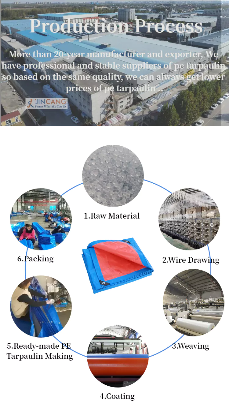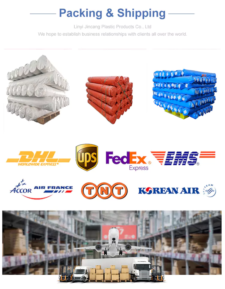 Jincang je jedným z profesionálnych výrobcov PE plachty v Číne, 90 GSM Strip PE plachta Roll je balená po roli. Šírka je zvyčajne 1,83 m, 2 m, 4 m, 5 m, 6 m. Dĺžka je zvyčajne 63 m, 91, 100 m 200 m atď. A tiež môžeme prispôsobiť podľa vašich požiadaviek. Široko sa používa na vonkajšiu ochranu, zakrytie tovaru, stavenísk, poľnohospodárske účely a dočasné prístrešky.